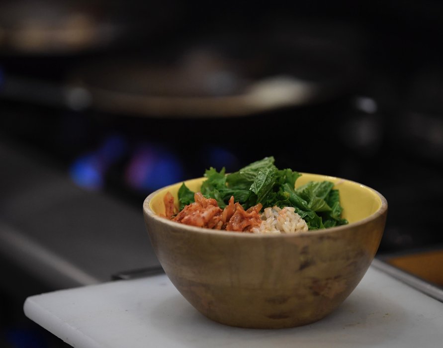 Salmon, Brown rice, Edamame, Kale, Steamed Brussel Sprouts, nori sesame seeds, shaved Carrots, Crispy onions, sesame Dressing