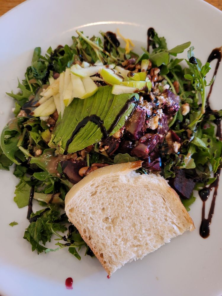 Arugula, frisee, radicchio, quinoa, avocado, marinated chickpeas, cucumber, dried apricots, sliced almonds, orange balsamic